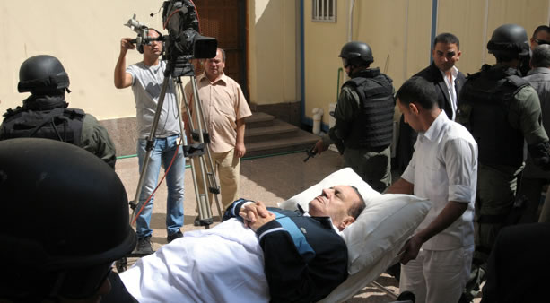 Former Egyptian president Hosni Mubarak lies on a stretcher while being taken to the courtroom for another session of his trial in Cairo, Egypt, Sept. 7, 2011. (Mohammed al-Law/Associated Press)