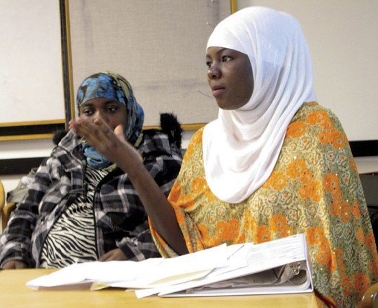 Zahara Haji (foreground) and Amina Abdullahi, research assistants in Betancourt’s project with the Somali Bantu refugee community in Boston, during a presentation at Chelsea City Hall
