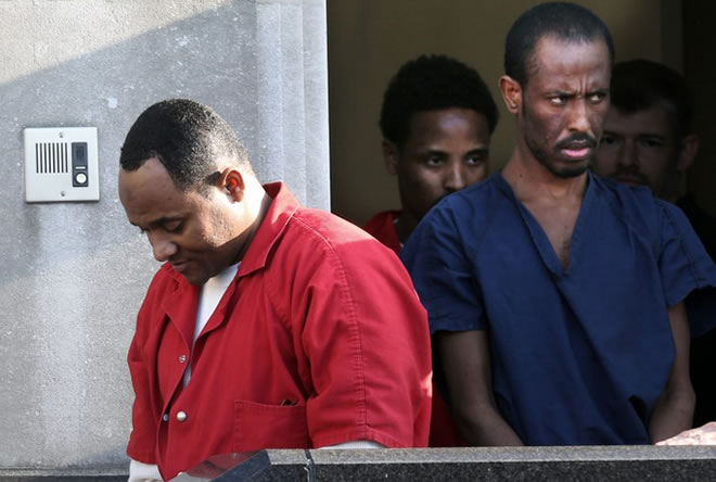 Shani Nurani Shiekh Abrar, left, and Ahmed Muse Salad, right, leave the federal courthouse in Norfolk on Tuesday, June 4, 2013. In the background, center, is Abukar Osman Beyle. (Steve Earley | The Virginian-Pilot)