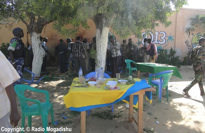"First a suicide car bomb rammed into the gate of the restaurant and it caused no casualty. Then another blast went off when people converged," Abdiqadir Mohamed, a senior police officer, told Reuters.