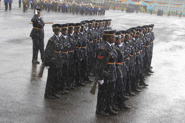 Police recruits brave a rainy weather during a pass out ceremony at Kiganjo Police Training college in Nyeri County on April 4, 2014. The ceremony was graced by President Uhuru Kenyatta. Photo/ JOSEPH KANYI