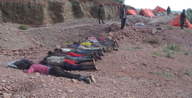 EDS NOTE: GRAPHIC CONTENT - Bodies of Kenyans lie at a quarry in Mandera County, Kenya, Tuesday, Dec. 2, 2014. Kenya police said that at least 36 quarry workers were killed in an attack in northern Kenya by suspected Islamic extremists from Somalia. Kenyan police chief David Kimaiyo confirmed the workers were killed early Tuesday in Mandera County. (AP Photo)