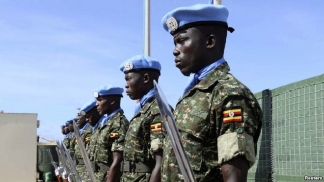 Ugandan peacekeeping troops stand during a ceremony at Mogadishu airport in Somalia.