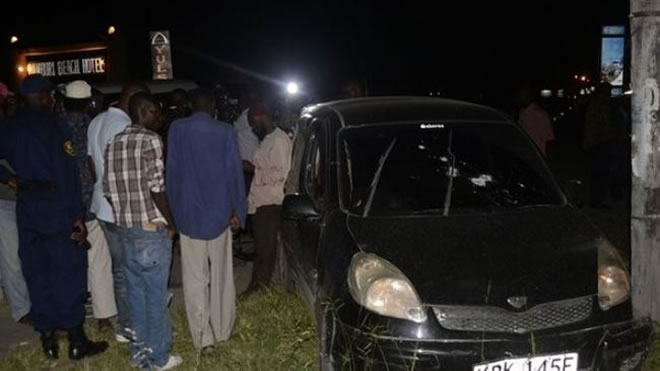 Relatives and local people gather at the scene where Muslim cleric Sheikh Ibrahim Rogo and three others were shot dead in the Kenyan coastal city of Mombasa, October 3, 2013.