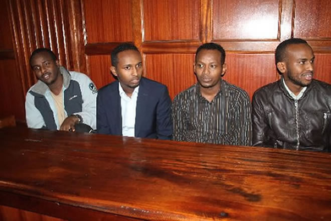 Four suspects, among them an employee of the Somali embassy, were Tuesday charged with committing and planning terror attacks in Kenya.The first count against Mr Hassan Abdi Mohamud, Mr Mohammed Osman Ali, Mr Ilyas Yusuf Warsame and Mr Garad Hassan Fer, all from Somalia, was that of commissioning a terrorist attack at Java Restaurant at Jomo Kenyatta International Airport on January 16.
