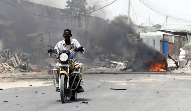 A motorcyclist rides away from the scene of an explosion near the entrance of the airport in Somalia's capital Mogadishu February 13, 2014. REUTERS/Feisal Omar
