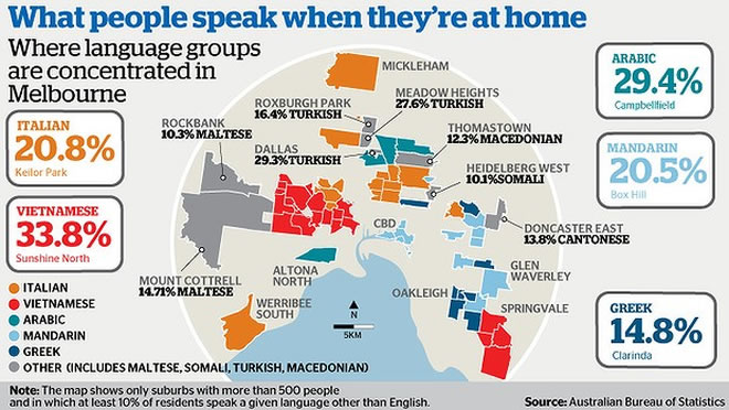 Only 44 of Victoria's 1546 suburbs are home to a Somali speaker. Italian is the most widely dispersed non-English language, followed by German and Dutch.