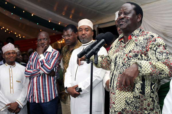 LABAN WALLOGA Cord leader Raila Odinga with Mombasa Governor Hassan Joho (next to him) and Senators Moses Wetangula and Boni Khalwale among other guests at the governor’s Ifthar ceremony on July 14, 2014. Mr Odinga asked the government to disclose how many Kenyan soldiers had been killed in Somalia.