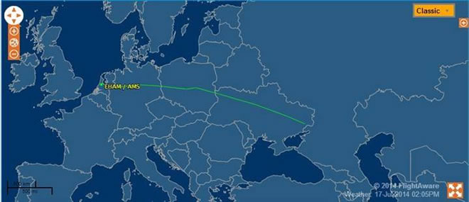 Data from the website FlightAware showed that Flight 17 took off from Amsterdam at about 6:30 a.m. ET. Its last recorded position was over Ukraine, west of the Russian border, at 9:19 a.m. ET.