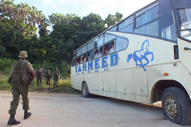 he Tahmeed bus after the attack in Lamu County, July 19, 2014. A dusk to dawn curfew has been declared in Lamu a day after seven people, including four policemen, were killed. ATHMAN OMAR/NATION