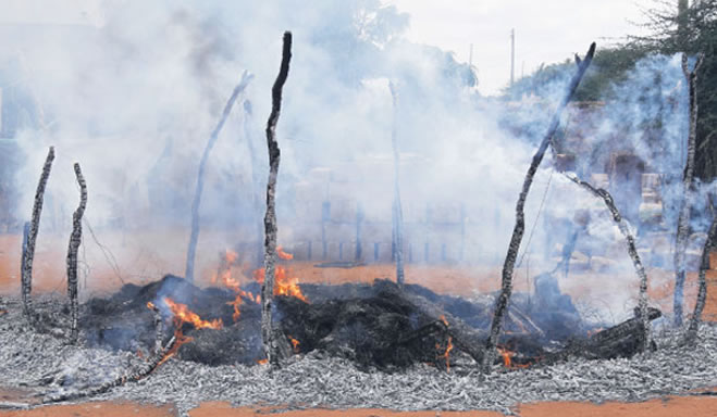 Smoke billows from some of the houses set ablaze in Wabir village by youths avenging the killings during the clashes between the Garre and the Degodia. PHOTO | JEFF ANGOTE