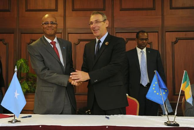 EU Special Envoy Michele Cervone d'Urso announced "This is more than a symbolic moment. The joint signature of the multi-annual indicative programme for Somalia is a response to the New Deal Compact signed in Brussels last year and allows to translate in concrete terms Somalia's accession to the Cotonou Agreement. The EU commits for the coming years 286 million EUR ( 400 millionUSD) to rebuild a peaceful and prosperous Somalia".