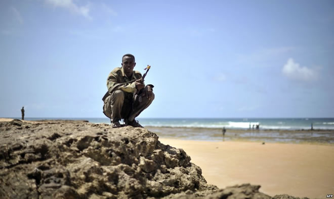 A handout picture released by the African Union-United Nations Information Support Team shows an armed man squatting at a beach during a demonstration by a local militia, formed in order to provide security in the town of Marka, April 30, 2014.