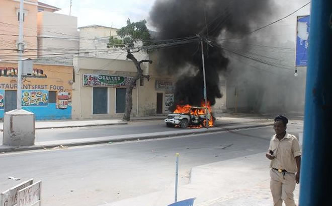 Security forces and civilians gather around a car which exploded on the Maka Almukarama road in Mogadishu, one of the seaside capital's busiest and central roads, on November 16, 2014 ©Abdifitah Hashi Nor (AFP).