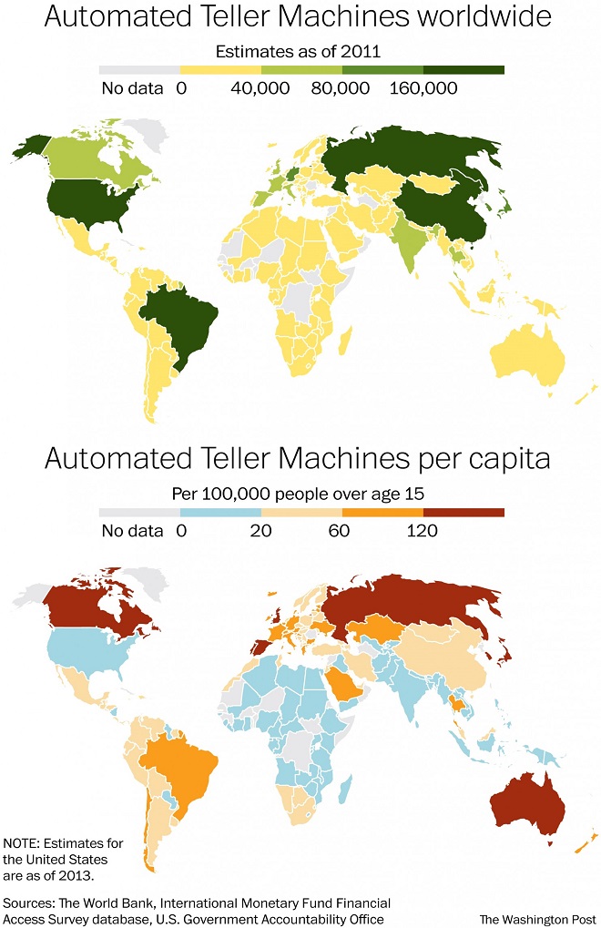 But what countries other than Somalia have lagged behind in the use of ATMs? Myanmar was once renowned for its lack of ATMs, and the inability (or refusal) of businesses to accept credit cards, but in the past couple of years that has changed. These maps, made using estimates from the World Bank, show where the world's ATMs are: