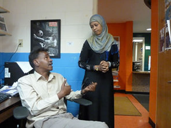 Bihi works from a cramped cinder-block office in a community center that serves the needs of a Somali neighborhood called Cedar-Riverside — where working-class families pack into crowded high-rises, where women in bright African prints and colorful scarves shop at the many Somali-owned businesses, and rent the latest movies from Mogadishu.