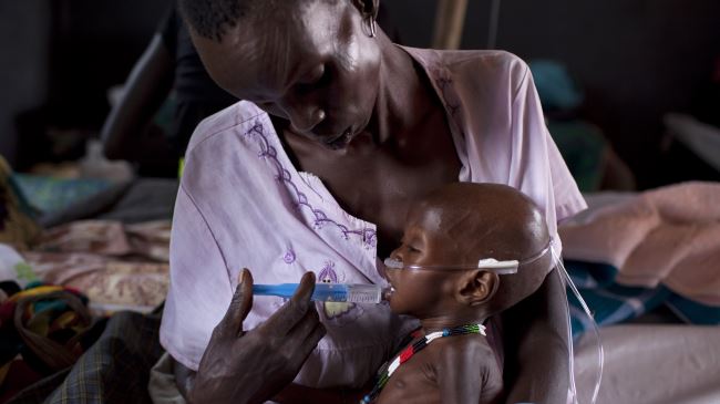 A photo taken on March 3, 2014 shows a child suffering from severe malnutrition receiving assistance from a member of the medical staff in a medical camp run by Doctors without Borders, in Minkamman, South Sudan.