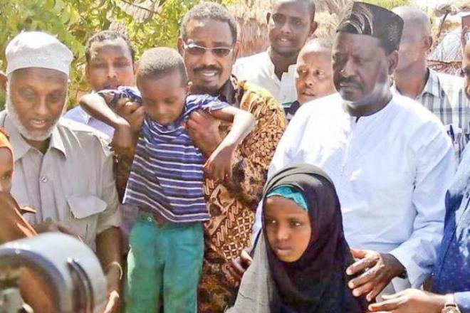 Condolence visit: Cord leader Raila Odinga and National Assembly former Deputy Speaker Farah Maalim with the late Isnina Sheikh?s family in Mandera on Wednesday Photo/Patrick Vidija
