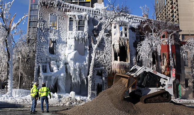 Crews work at the scene a day after an apartment fire in the Cedar-Riverside neighborhood of Minneapolis, Jan. 2, 2014. Jeffrey Thompson / MPR News file
