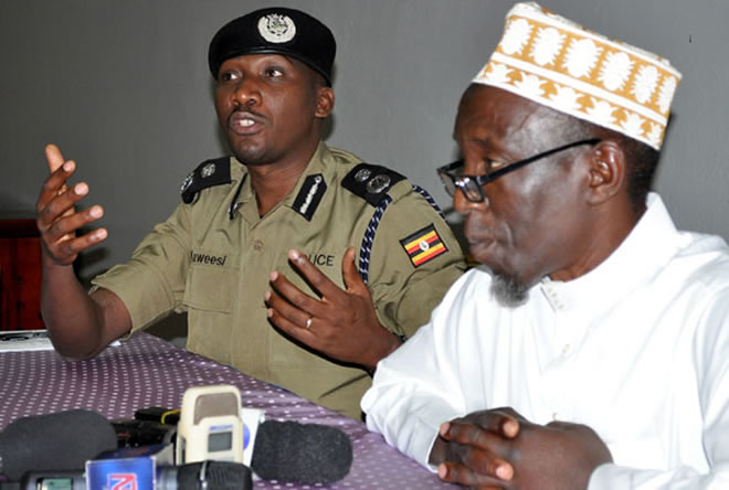 The director of police operations, Mr Andrew Felix Kaweesi (L), and the national chairperson of Uganda Muslim Youth Assembly, Sheikh Abasi Kiyimba, address a press conference in Kampala yesterday. PHOTO BY RACHEL MABALA