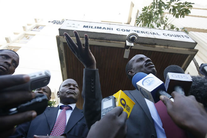 Knut Secretary-General Wilson Sossion (right) and Kenya Union of Post-Primary Education Teachers (Kuppet) Secretary-General Akelo Misori address journalists after their meeting with Justice Nduma Nderi at a Nairobi Court on January 14, 2015 where they agreed to call off the teachers strike