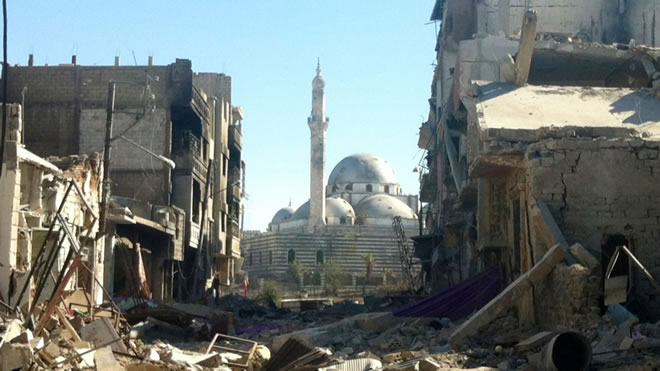 July 2013: Damaged buildings in front of the Khaled bin Walid mosque in the central Syrian city of Homs. (Sam Skaine, Getty)