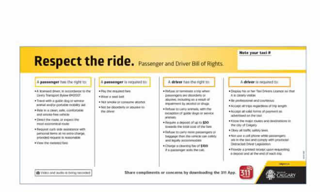 A copy of the Passenger and Driver Bill of Rights, which is now required to be displayed in every taxi in Calgary. Enforcement will begin September 1.