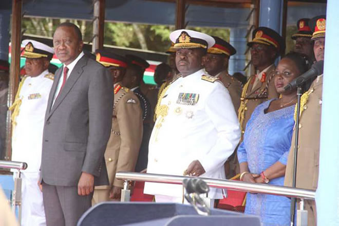 President Uhuru Kenyatta from (left), Chief of the Defence Forces, General Samson Mwathethe and Defence CS Raychelle Omamo in Eldoret on July 10, 2015. The US Government has given the Kenya Defence Force Sh9.5 billion in aid this financial year to enhance the fight against Al-Shabaab.