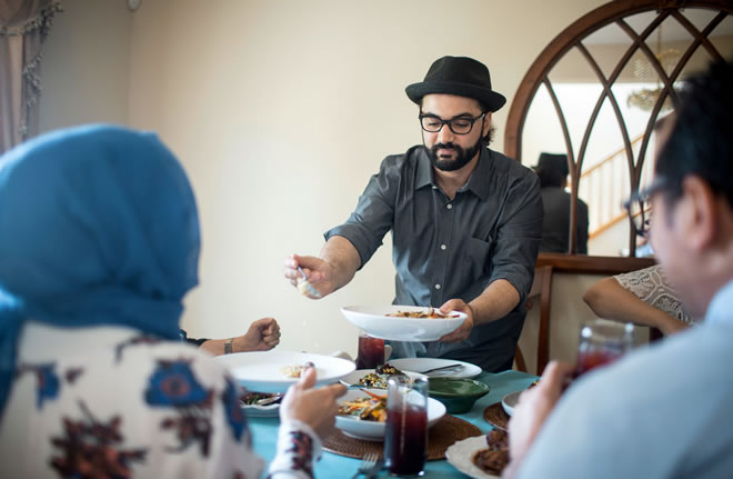 Muslims observing the fast try to eat extra dairy and protein at both meals to help stave off hunger the following day. Iftar invariably includes a bowl of dates, and sometimes more elaborate desserts, like pitted dates stuffed with nuts or labne (thick yogurt); ma’moul and ka’ak, round cookies filled with dates; and date paste rolled into cylinders or balls and coated with coconut.