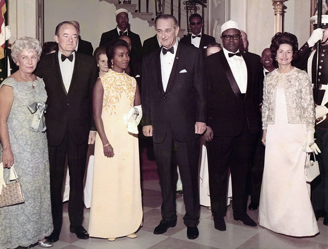 President Lyndon B. Johnson welcoming Somali Prime Minister Mohamed Hagi Ibrahim Egal and his wife Edna Adan Ismail, March 14, 1968 - (Remarks of Welcome at the White House to Prime Minister Egal of the Somali Republic).