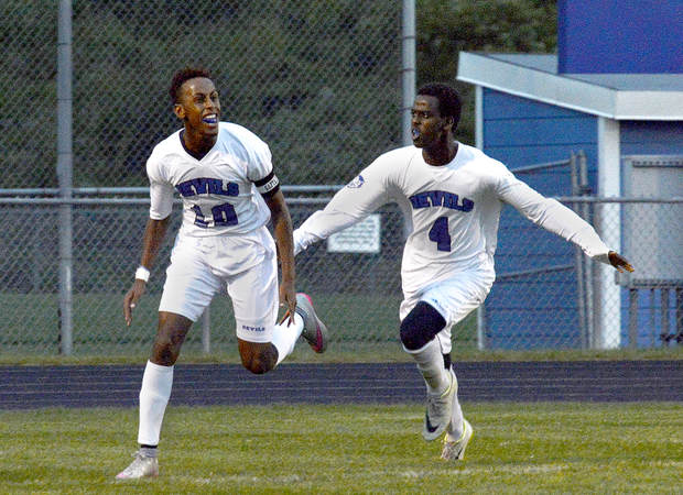 Lewiston High School's Abdi Shariff-Hassan, left, and Hassan Qeyle celebrate Shariff-Hassan's goal in the first half of their game against Camden Hills in Lewiston earlier this season.