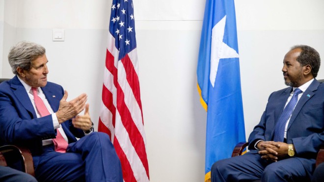 Secretary of State John Kerry meets with President Hassan Sheikh Mohammed, right, at the airport in Mogadishu, Somalia, Tuesday, May 5, 2015. (AP)