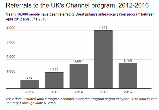 The Channel program has been especially contentious. Almost 4,000 children and adults were reported through it in 2015 alone — a nearly threefold jump since the year before. Last year, as national terror-related arrests reached record highs, the government announced that referring people to the program would now be a legal duty for educators, social workers and others.