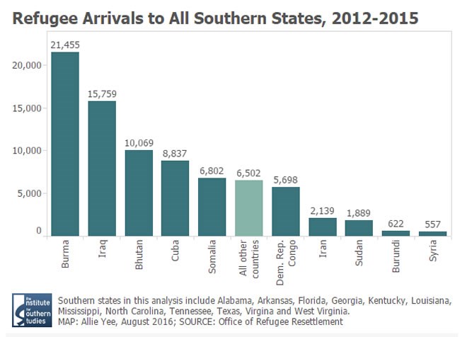 While concerns about those fleeing war-torn Syria have been the focus recently, refugees from that country have made up only about 1 percent of recent arrivals in the South between 2012 and 2015. Almost half have come from Burma and Iraq, with significant numbers from Bhutan, Cuba, Somalia and the Democratic Republic of Congo.
