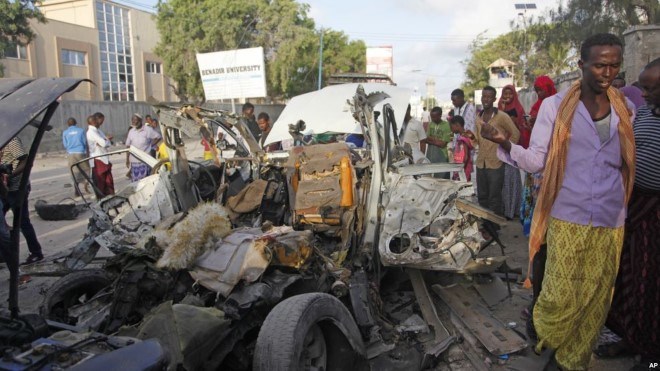 Somalis gather near the wreckage of a car used in an attack outside a beachfront restaurant in Mogadishu, Somalia, Aug. 26, 2016. Experts call for a unified counterterrorism effort.