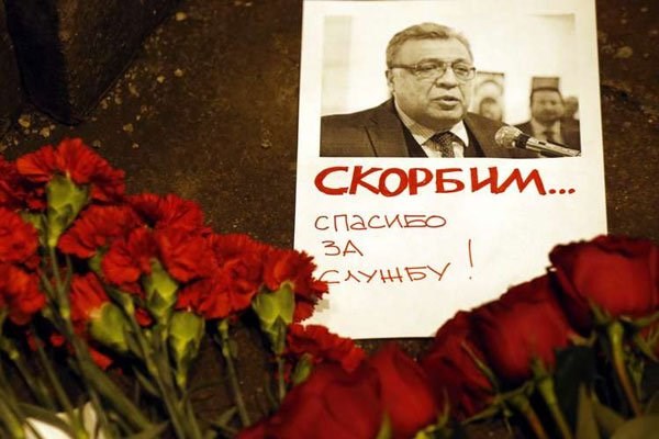 Flowers lie near a picture of Russia's ambassador to Turkey Andrei Karlov outside the Russian foreign ministry in Moscow, Russia, 19 December 2016. Mr Karlov was assassinated by a Turkish policeman at an art exhibition in the Turkish capital of Ankara. PHOTO | SERGEI ILNITSKY | EPA