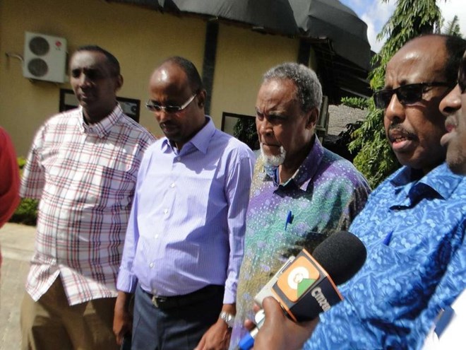 Northeastern regional coordinator Mohamud Saleh (R) addresses the press at a Garissa town hotel on August 28. He is with Garissa Senator Yussuf Haji, his Wajir counterpart Abdirahman Hassan and Lagdera MP Mohamed Shidiye / STEPHEN ASTARIKO