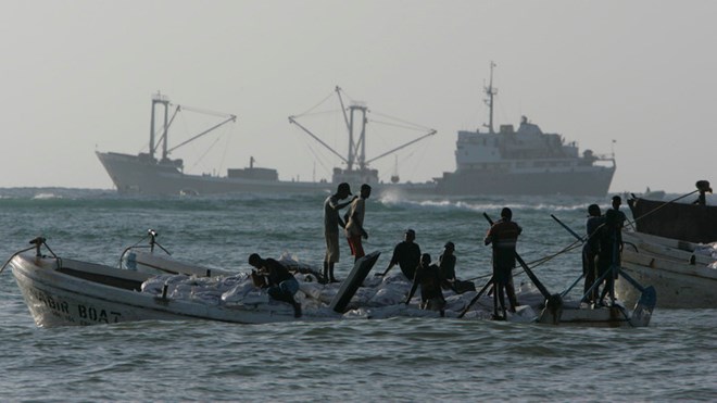 Somali men carry food aid on small boats where they off-loaded food from the cargo ship Victoria, background,, Tuesday, Dec. 18, 2007 in the Somali town of Merka, some 60 milessouth of Mogadishu. (File photo: AP)
