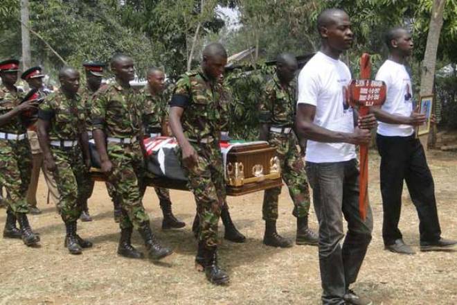 Two Kenyan soldiers who were killed by Al-Shabaab insurgents during a raid on their camp in Somalia last month were buried in Siaya and Turkana counties.A sombre mood Sunday engulfed Ururi Village in Bondo Sub-County, Siaya County, during the burial of Mr Eliakim Omenda, 29.