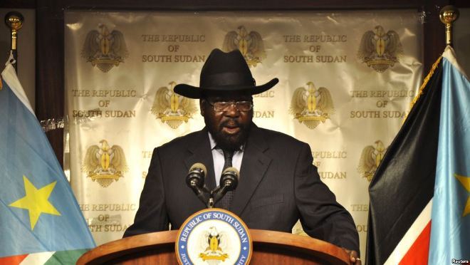 FILE - South Sudan's President Salva Kiir addresses a news conference at the Presidential palace in Juba. Ban's visit comes as opposing groups in the South Sudan peace process prepare to form a unity government.