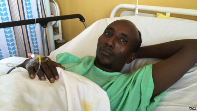 Salah Sabdow Farah was shot when the bus he was traveling in was attacked by al-Shabab militants in December 2015. He is recovering at Nairobi's Kenyatta National Hospital in January 2016.(J. Craig/VOA)