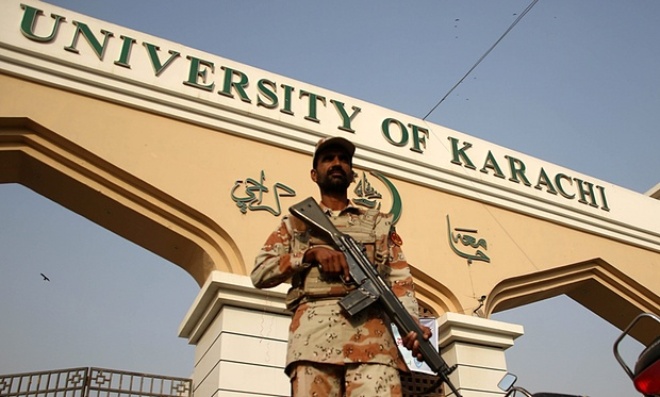 A Pakistani soldier stands guard outside the University of Karachi University as security has been high intensified following an attack on Bacha Khan University. Photograph: Shahzaib Akber/EPA