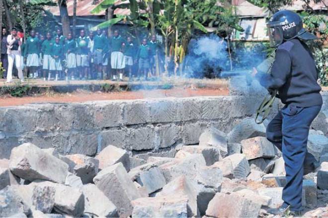 A police officer launches a tear gas canister at protesting Lang'ata Road Primary School pupils on January 20, 2015. Governments of East African countries continued last year to deny many basic freedoms to their citizens, Human Rights Watch said in its 2016 world report published on Wednesday. AFP FILE PHOTO | TONY KARUMBA