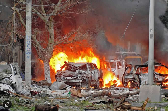 Wrecked cars burn at the scene of a terror attack by al Qaeda-linked al-Shabaab at Mogadishu’s Ambassador Hotel last year. German police arrested a 28-year-old German on suspicion of belonging to al-Shabaab on Monday. PHOTO: MOHAMED ABDIWAHAB/AGENCE FRANCE-PRESSE/GETTY IMAGES