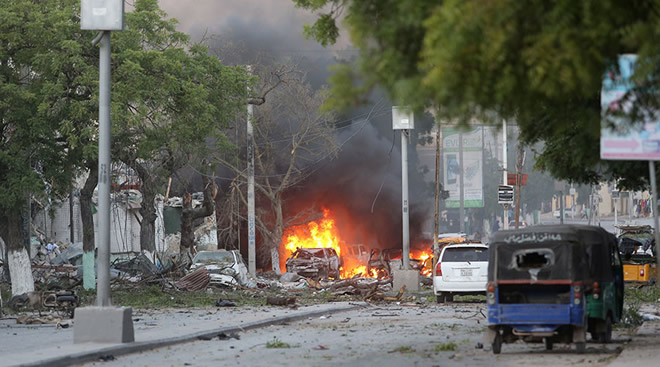 A general view shows the scene of a suicide car bombing outside Hotel Ambassador on Maka Al Mukaram Road in Somalia's capital Mogadishu, June 1, 2016. © Feisal Omar / Reuters