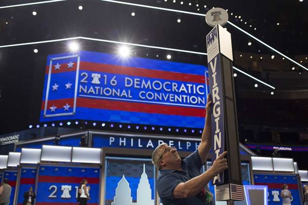 Jimmy Wright installs a sign for the Virginia delegation at the Wells Fargo Center on July 24, 2016 in Philadelphia, Pennsylvania. The Democratic National Convention opens July 25. PHOTO | AFP