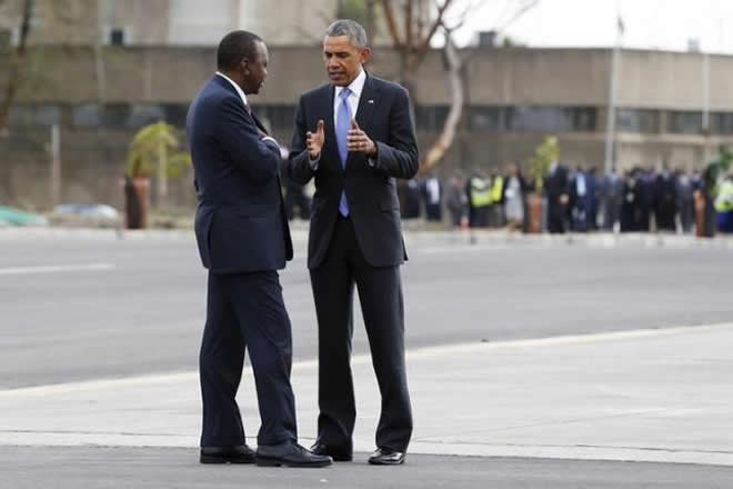 U.S. President Barack Obama (R) walks with Kenya's President Uhuru Kenyatta as he departs for Ethiopia aboard Air Force One from Jomo Kenyatta International Airport in Nairobi July 26, 2015.