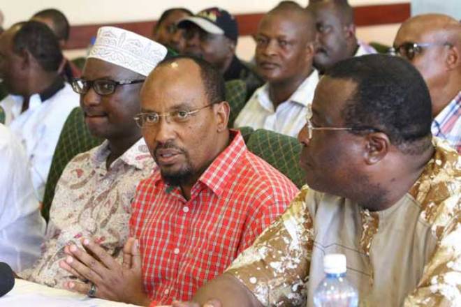 From left, front row: Isiolo Governor Godana Doyo, Mandera Senator Billow Kerrow and Senate Speaker Ekwee Ethuro during the Pastoralist Leadership Summit held in Isiolo on March 12, 2016. The leaders announced the formation of a Northern Kenya party. The move is being seen as a move to isolate National Assembly leader Aden Duale and clip his powers. PHOTO | PHOEBE OKALL | NATION MEDIA GROUP