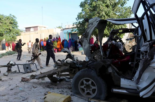 Residents look at the wreckage of a car destroyed when Islamist militants opened fire on government officials in a car and then a car bomb exploded, according to police and a spokesman for Mogadishu's mayor, in Yaqshiid district of Somalia's capital Mogadishu, April 18, 2016.