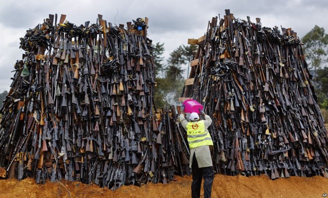 Deputy President William Ruto presided over the burning of rifles and pistols in three stacks about 15 feet high. They were recovered in this East African country over the past nine years, Ruto said.